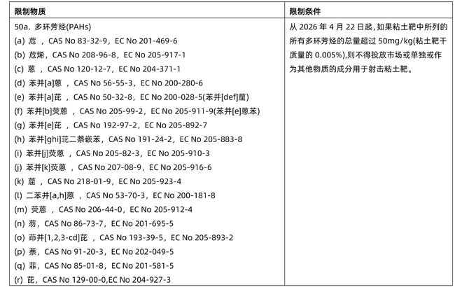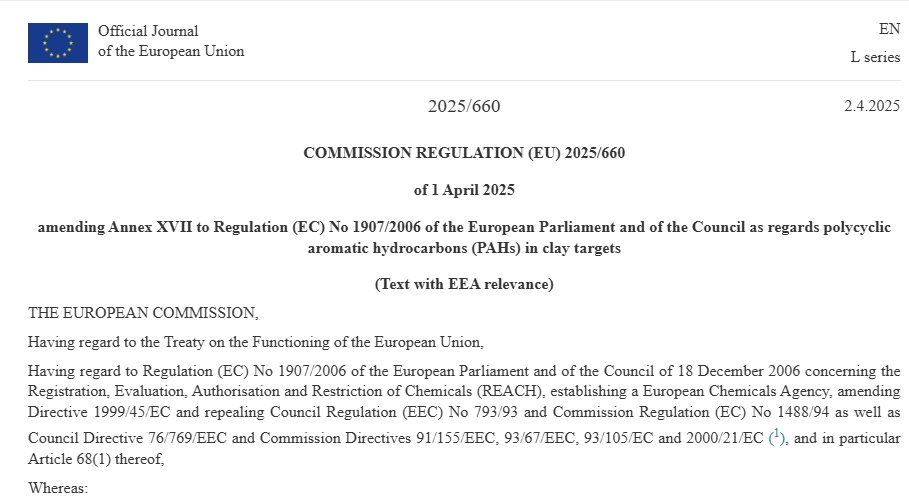 On April 2, 2025, the European Commission approved and published Regulation (EU) 2025/660, adding Item 50a to Annex XVII of EU REACH Regulation (EC) No 1907/2006, limiting the content of 18 polycyclic aromatic hydrocarbons (PAHs) in clay targets for shooting. The amendment will take effect on April 22, 2025, and will be enforced on April 22, 2026.