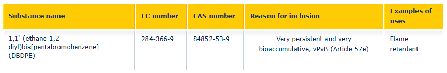 Helsinki, 5 November 2025 – ECHA’s Member State Committee confirmed the addition of 1,1'-(ethane-1,2-diyl)bis[pentabromobenzene] (DBDPE) to the list in its October meeting. The substance has very persistent and very bioaccumulative properties and is used as a flame retardant in various industries. This identification will support the potential restriction work on brominated flame retardants.