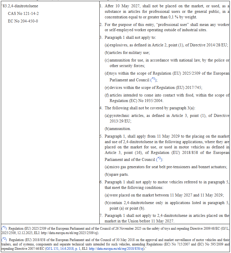 (12)The dossier proposed to exempt from the scope of the restriction also articles for which the presence of carcinogens is regulated by Union legislation, in particular Regulation (EU) 2025/2509 of the European Parliament and of the Council (6) on the safety of toys and repealing Directive 2009/48/EC, and Regulation (EU) 2017/745 of the European Parliament and of the Council (7) on medical devices. It also proposed to exempt articles covered by Regulation (EC) No 1935/2004 of the European Parliament and of the Council (8) on food contact materials because 2,4 DNT is already regulated in plastic food contact materials.