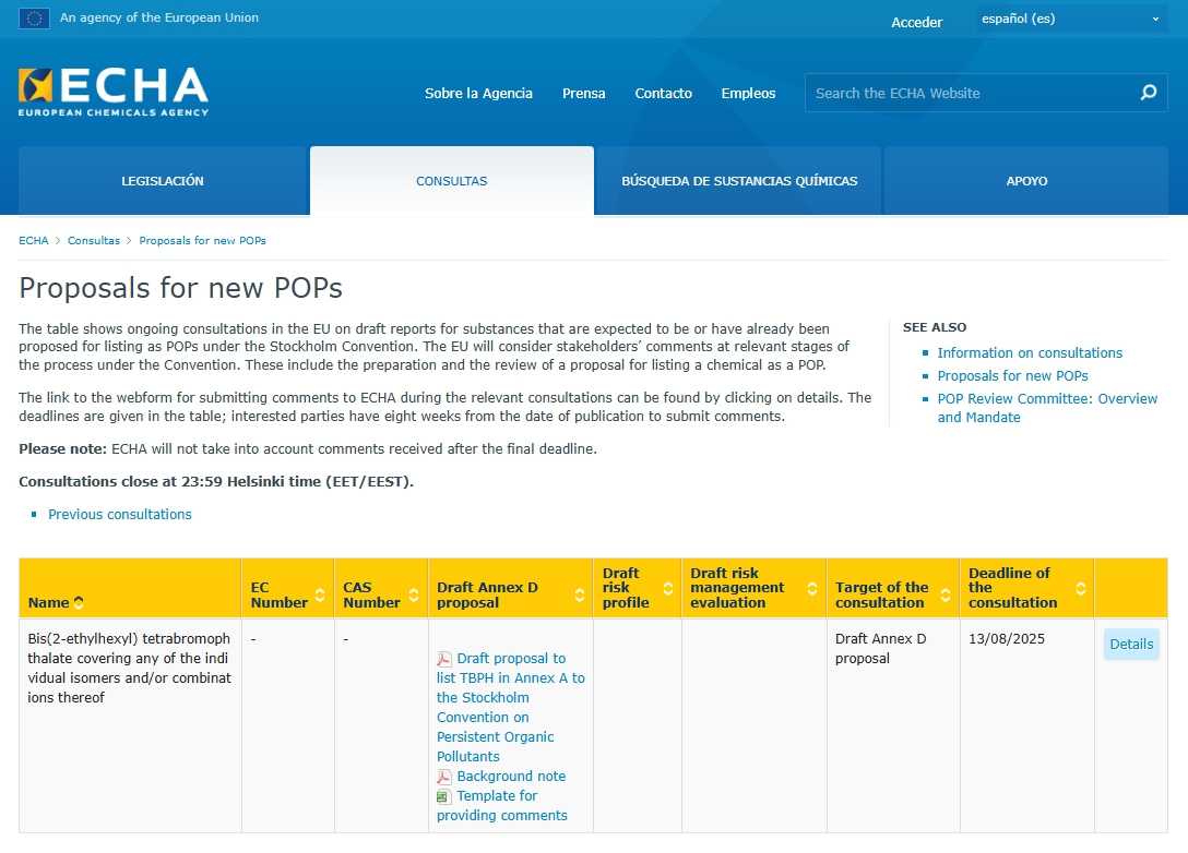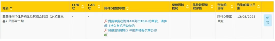 2025年6月18日,欧盟化学品管理局发布公众咨询,本次是针对于四溴邻苯二甲酸双(2-乙基己基)酯覆盖任何单个异构体和/或其组合物质,CAS:26040-51-7增加至POP法规进行风险评估的公众咨询,截止至2025年8月13日。