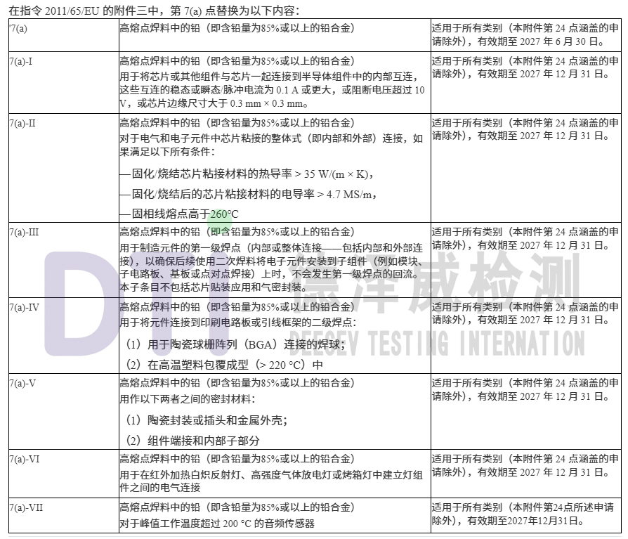 (7)对申请豁免续期的评估结论是,含铅高熔点焊料广泛应用于各种电气和电子设备中。这类焊料的铅含量超过85%(重量比),并具有高熔点、导电性、导热性、延展性、耐腐蚀性、合适的抗氧化性和润湿性等关键性能。