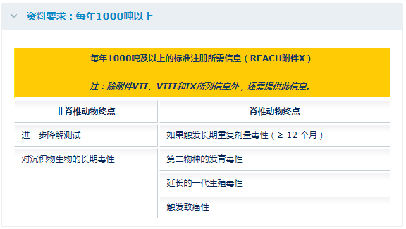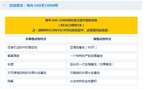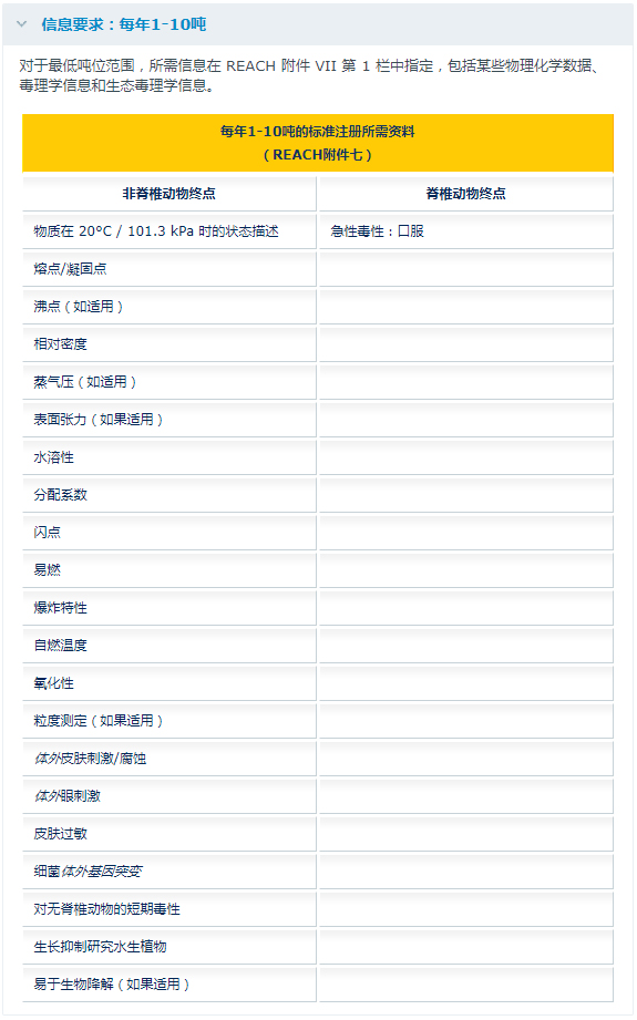 根据REACH附件 VII 至 X,每个注册人需要根据他们制造或进口物质的吨位水平确定他们的信息要求。