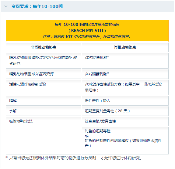 (i) 每年注册 1 至 10 吨物质的具体案例:如果您可以证明您的物质具有预测的低风险,您可以从减少的信息要求中受益。