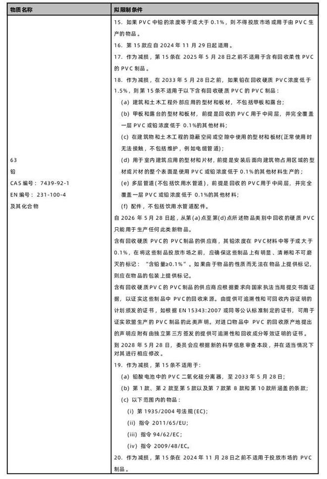 Starting from November 29, 2024, lead shall not be placed on the market or used in items produced from vinyl chloride (PVC) polymers or copolymers, with a concentration exceeding 0.1% by weight of PVC material.