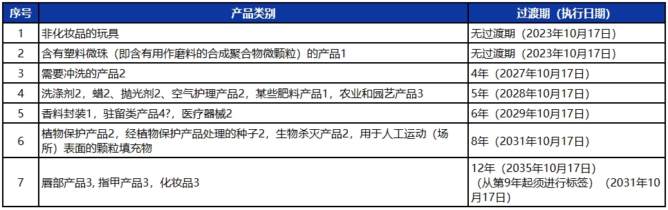 法规对特定产品(例如:化妆品、洗涤剂、蜡、抛光剂、空气护理产品、医疗器械、农业和园艺产品、人工运动(场所)表面的颗粒填充物中)的合成聚合物微颗粒(SPM)给定了过渡期: