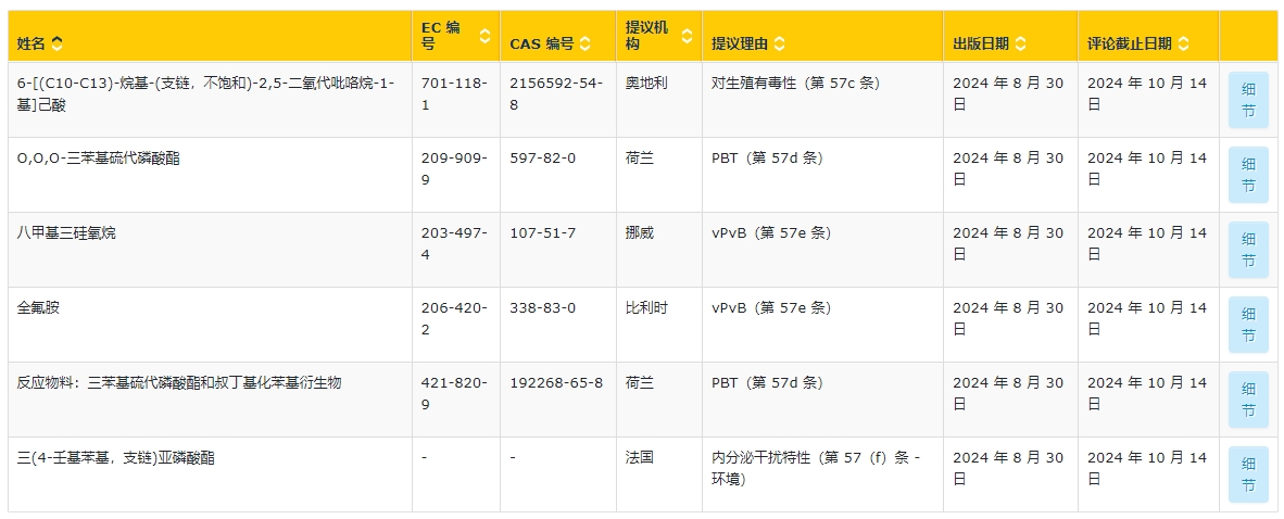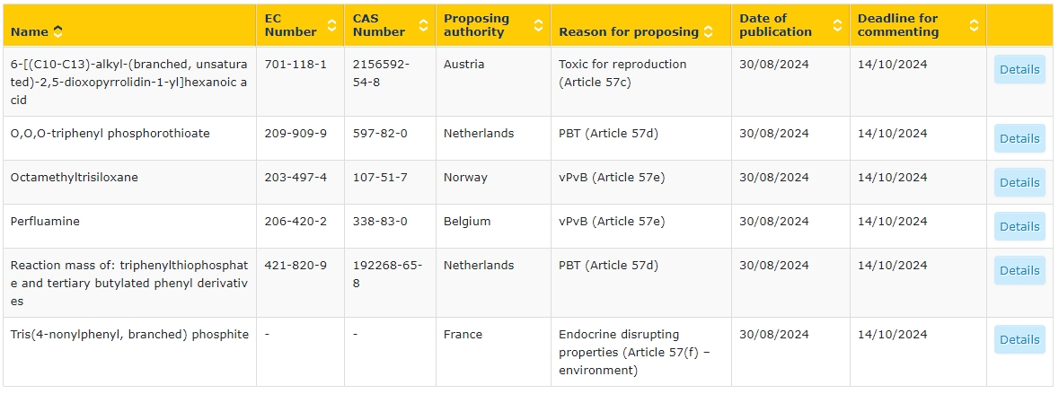 2024年8月30日,欧洲化学品管理局(ECHA)对以下6种潜在的SVHC候选物质展开公众咨询,公众咨询将于2024年10月14日结束,在此期间各利益相关方均可向ECHA提交评议意见。如果某种物质被认定为 SVHC,它将被添加到候选清单中,并最终被列入授权清单。