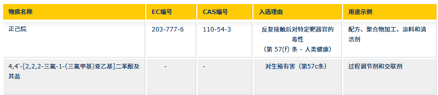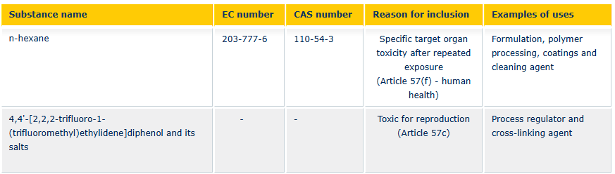 赫尔辛基,2026年2月4日——新增物质包括正己烷和4,4'-[2,2,2-三氟-1-(三氟甲基)亚乙基]二苯酚及其盐类。它们分别用于配方、聚合物加工、涂料、清洁剂以及作为工艺调节剂和交联剂。