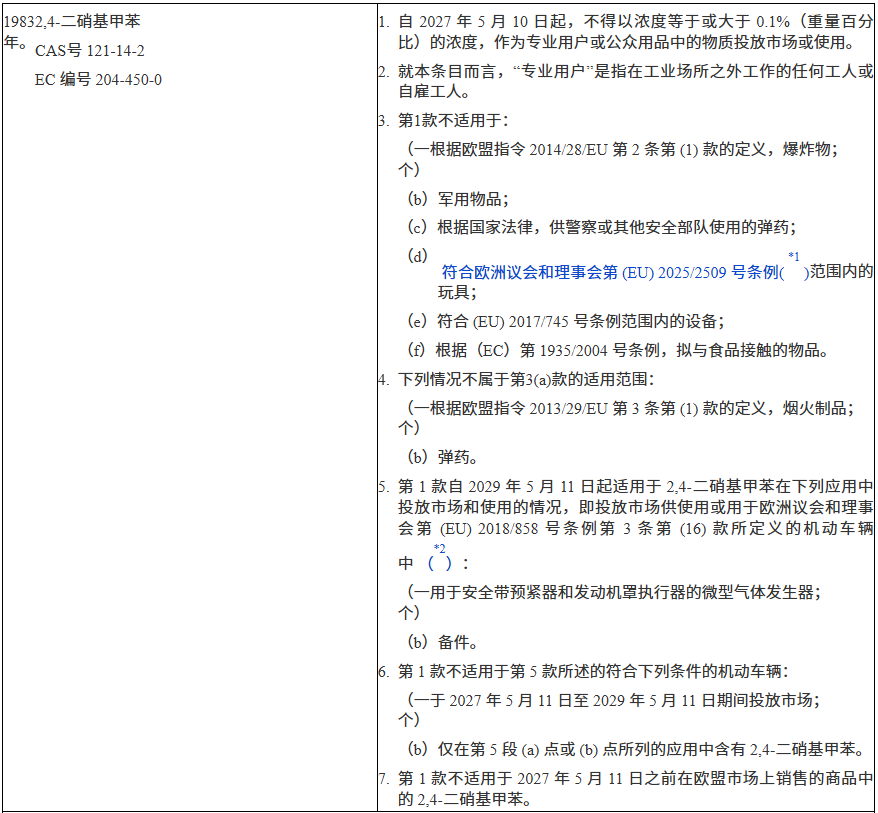 (12)、该文件建议将欧盟法律对致癌物含量进行管制的物品也排除在该限制范围之外,特别是欧洲议会和理事会关于玩具安全和废除2009/48/EC指令的(EU) 2025/2509号条例(6)以及欧洲议会和理事会关于医疗器械的(EU) 2017/745号条例(7)。该文件还建议将欧洲议会和理事会关于食品接触材料的(EC) No 1935/2004号条例(8)所涵盖的物品排除在外,因为2,4-二硝基甲苯(2,4-DNT)已在塑料食品接触材料中受到管制。