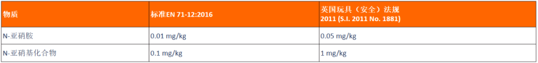 *注:标准EN 71-12:2016中第4.2条表2第a点中的限值(即针对意图供36个月以下儿童使用,且意图或可能放入口中的弹性体玩具的限值)低于英国玩具(安全)法规2011 (S.I. 2011 No. 1881)附表2第3部分第8点中规定的符合的限值。这些限值具体如下: